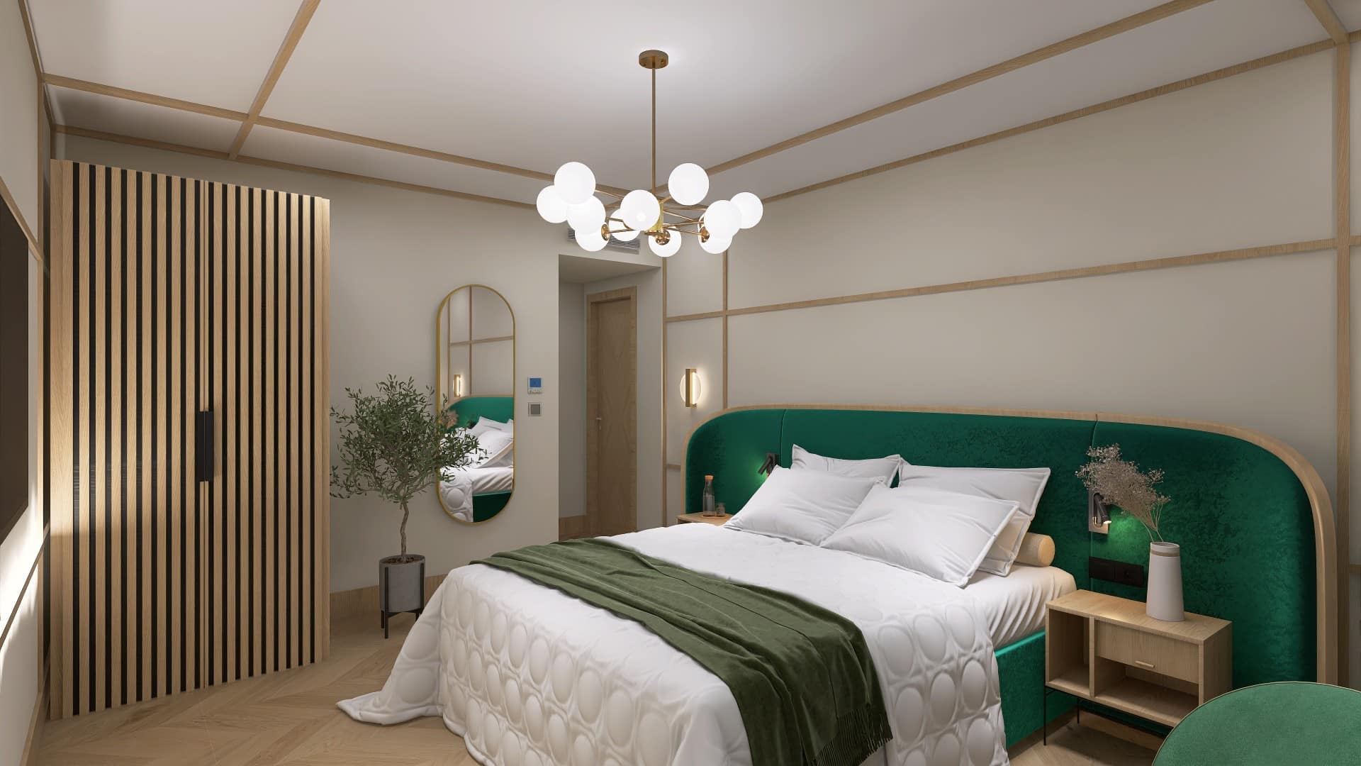 Una paleta ligera de tonos tierra y otoñales crean un santuario que es a la vez cálido, sereno y acogedor. Los ventanales transparentes desvelan una luz natural potenciada gracias al estar la habitación ubicada en un quinto piso. Un práctico baño revestido de materiales que evocan mármol, con ducha separada y elementos minimalistas invitan a dedicarse un tiempo con el objetivo de prepararse para seguir disfrutando en compañía, pero de una forma selecta, del centro de la ciudad de Madrid.