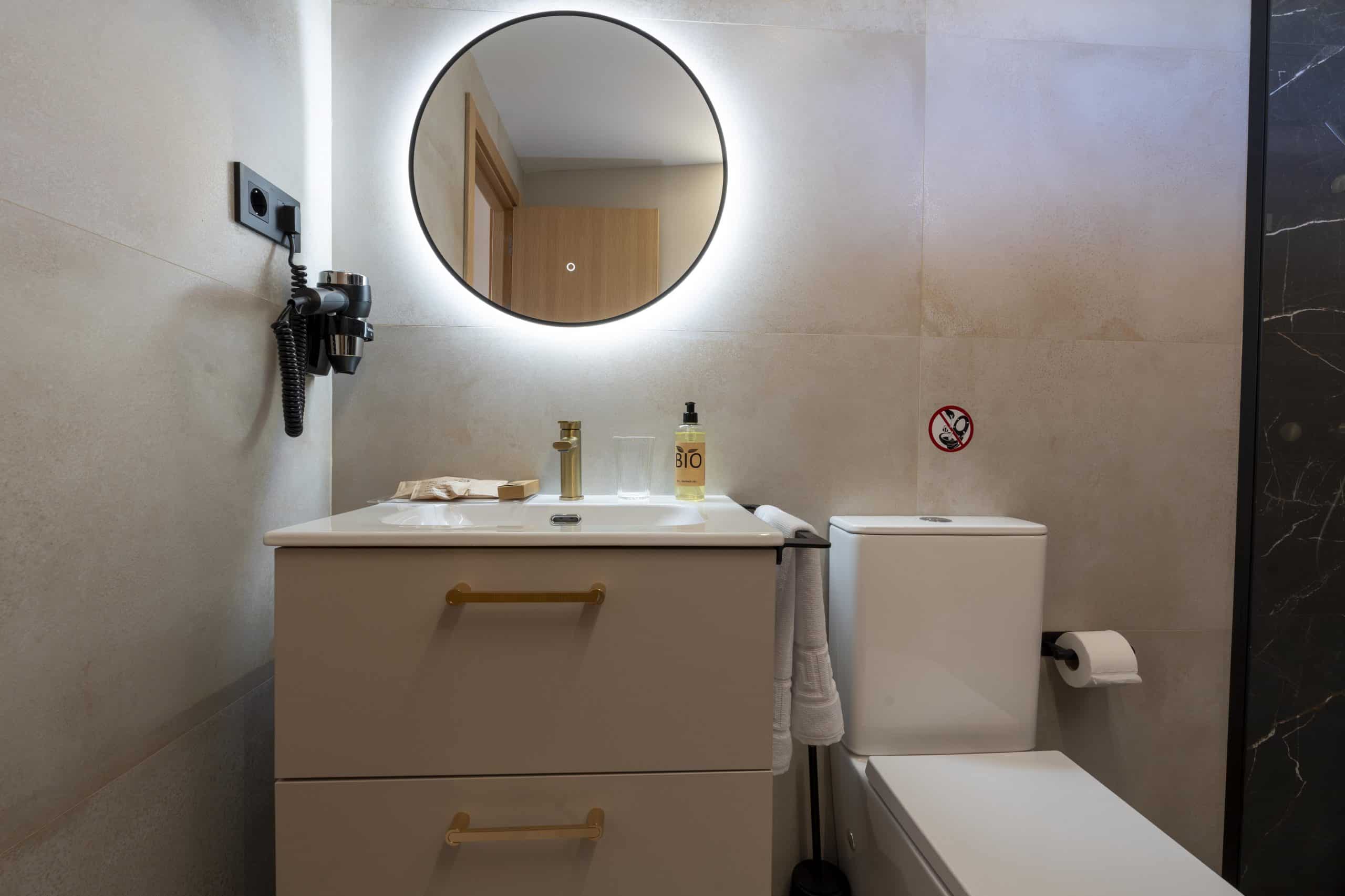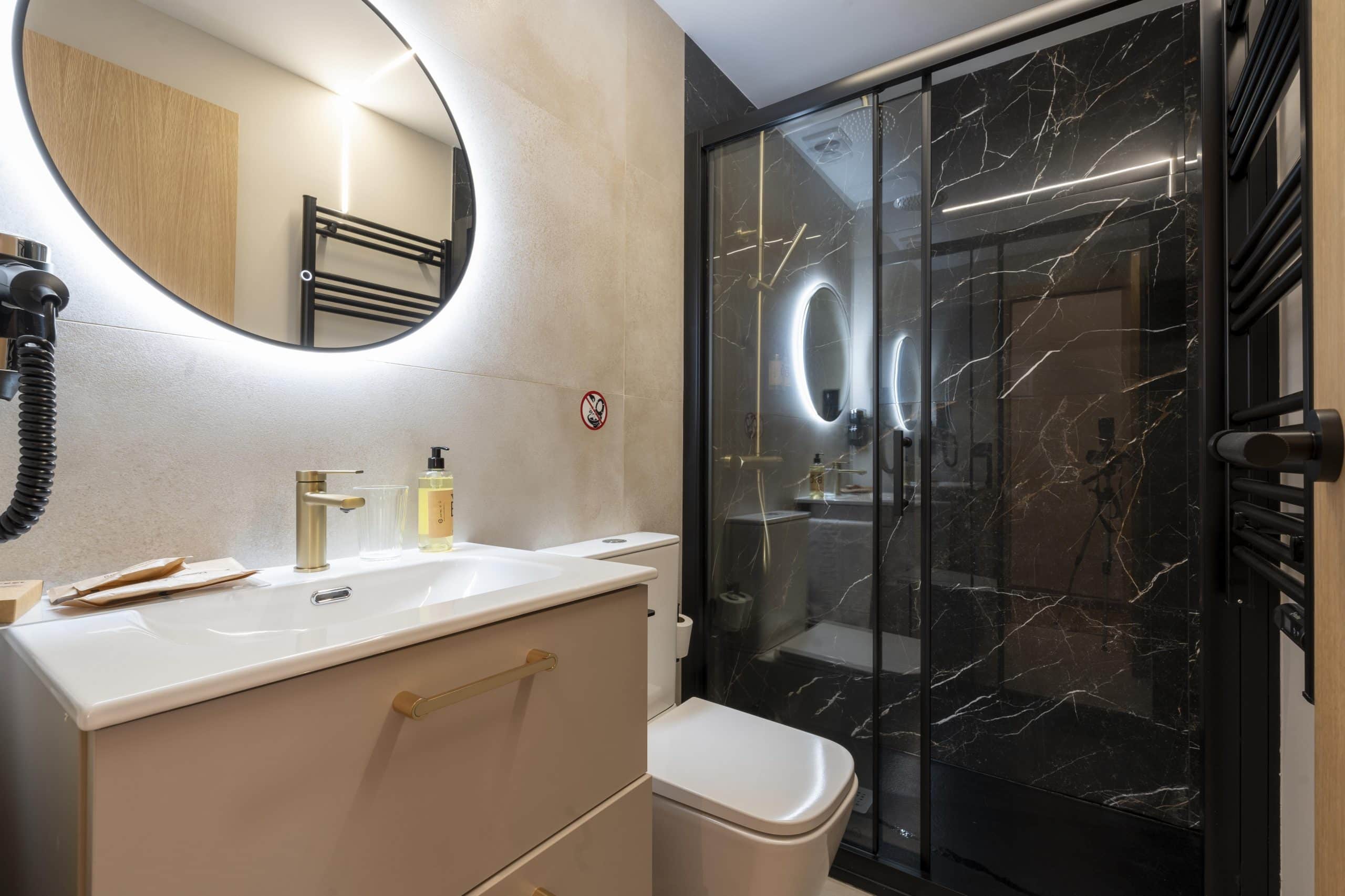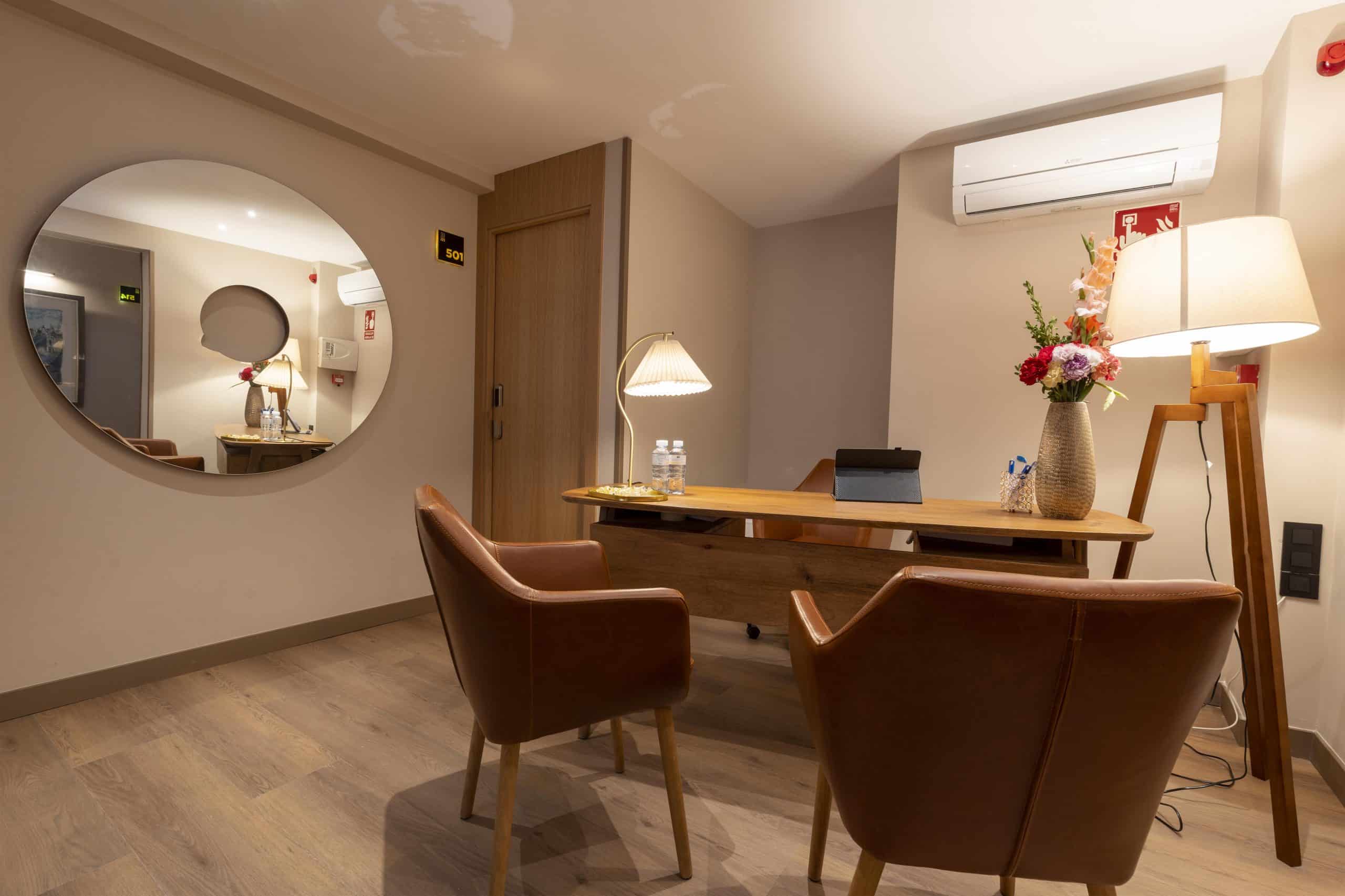Una paleta ligera de tonos tierra y otoñales crean un santuario que es a la vez cálido, sereno y acogedor. Los ventanales transparentes desvelan una luz natural potenciada gracias al estar la habitación ubicada en un quinto piso. Un práctico baño revestido de materiales que evocan mármol, con ducha separada y elementos minimalistas invitan a dedicarse un tiempo con el objetivo de prepararse para seguir disfrutando en compañía del centro de la ciudad de Madrid.