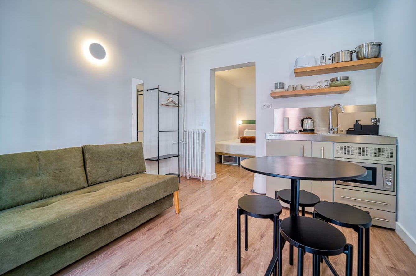 Ubicado en pleno centro, este apartamento combina practicidad, estilo y una ubicación inmejorable. Los ventanales transparentes desvelan una luz natural potenciada gracias a sus vistas a lugares de alto interés turístico tales como el Palacio Real de Madrid. Una práctica cocina americana con salón dependiente invitan a relajarse cómodamente antes de seguir disfrutando del centro de la capital de España. Asimismo, para los huéspedes alojados en la ciudad por trabajo, el alojamiento ofrece acceso directo a una funcional zona coworking, área común de los Apartamentos Negresco Plaza España, abierta a todos los huéspedes.
